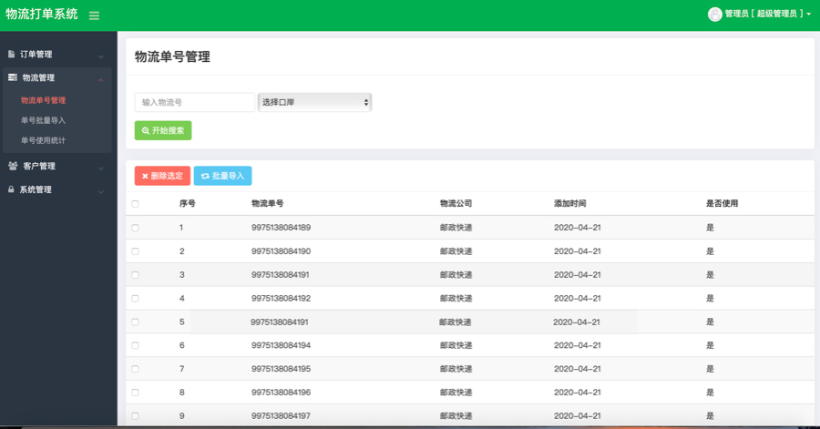 物流单号管理 | 物流单号列表 | 查看所有的物流单号,若已经匹配订单号,则显示对应的订单号以及匹配时间。 | |